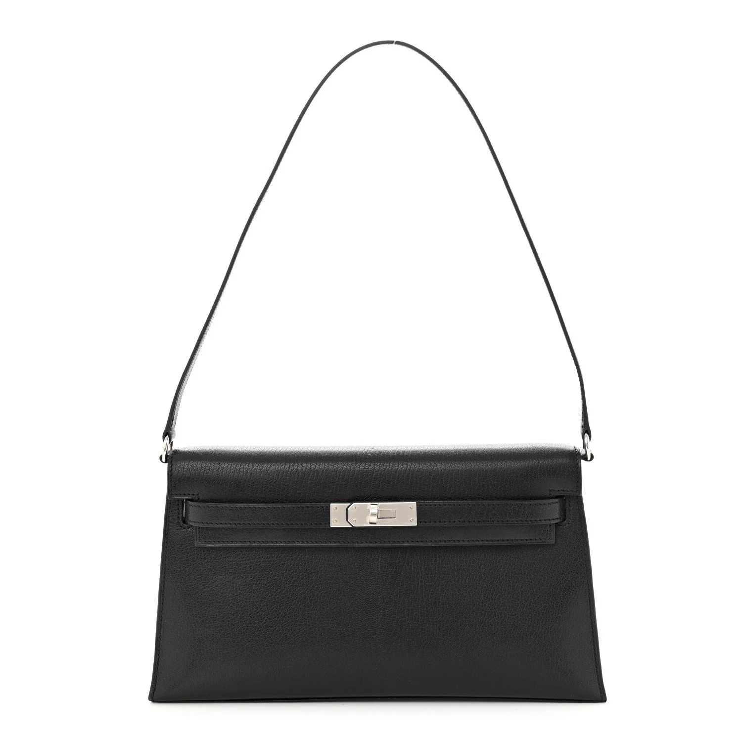 This is an authentic HERMES Chevre Chamkila Kelly Elan in Black. This handbag is crafted of fine goatskin leather in black. In the style of the Kelly handbags, the bag has a leather strap handle, a cross over flap and strap closure with a silver plated turn lock. This opens to a matte black leather interior with a patch pocket.