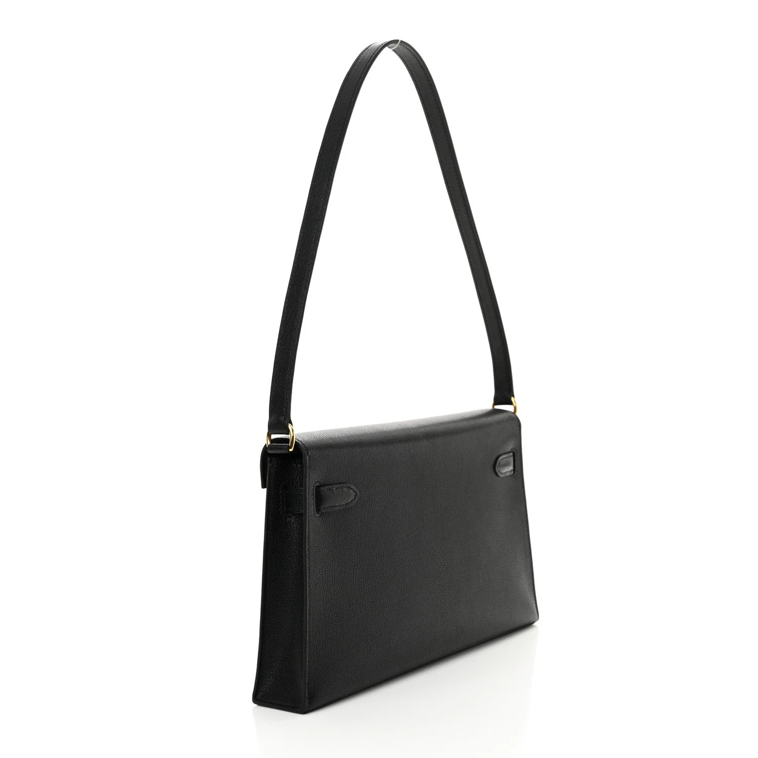 This is an authentic HERMES Chevre Chamkila Kelly Elan in Black. This handbag is crafted of fine goatskin leather in black. In the style of the Kelly handbags, the bag has a leather strap handle, a cross over flap and strap closure with a gold plated turn lock. This opens to a matte black leather interior with a patch pocket.