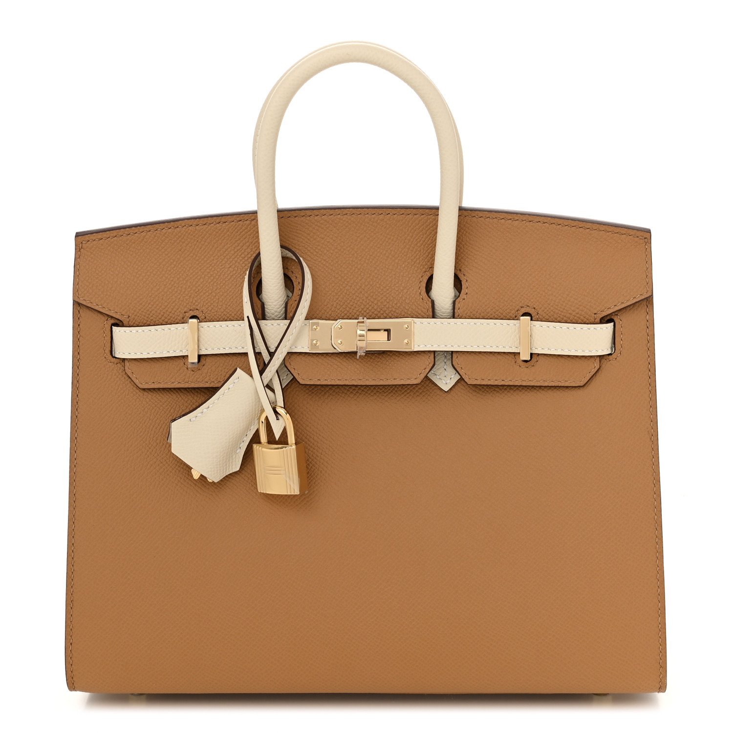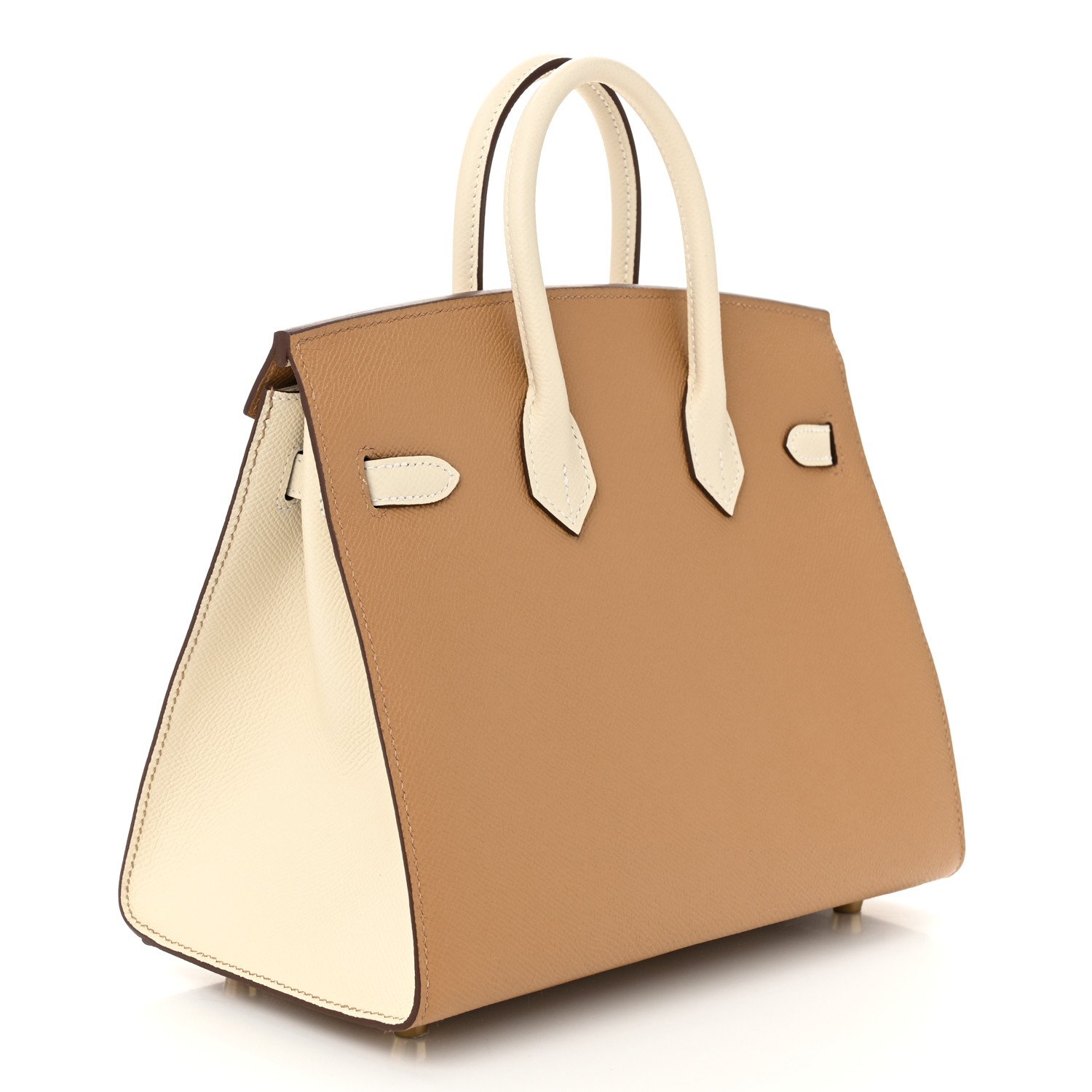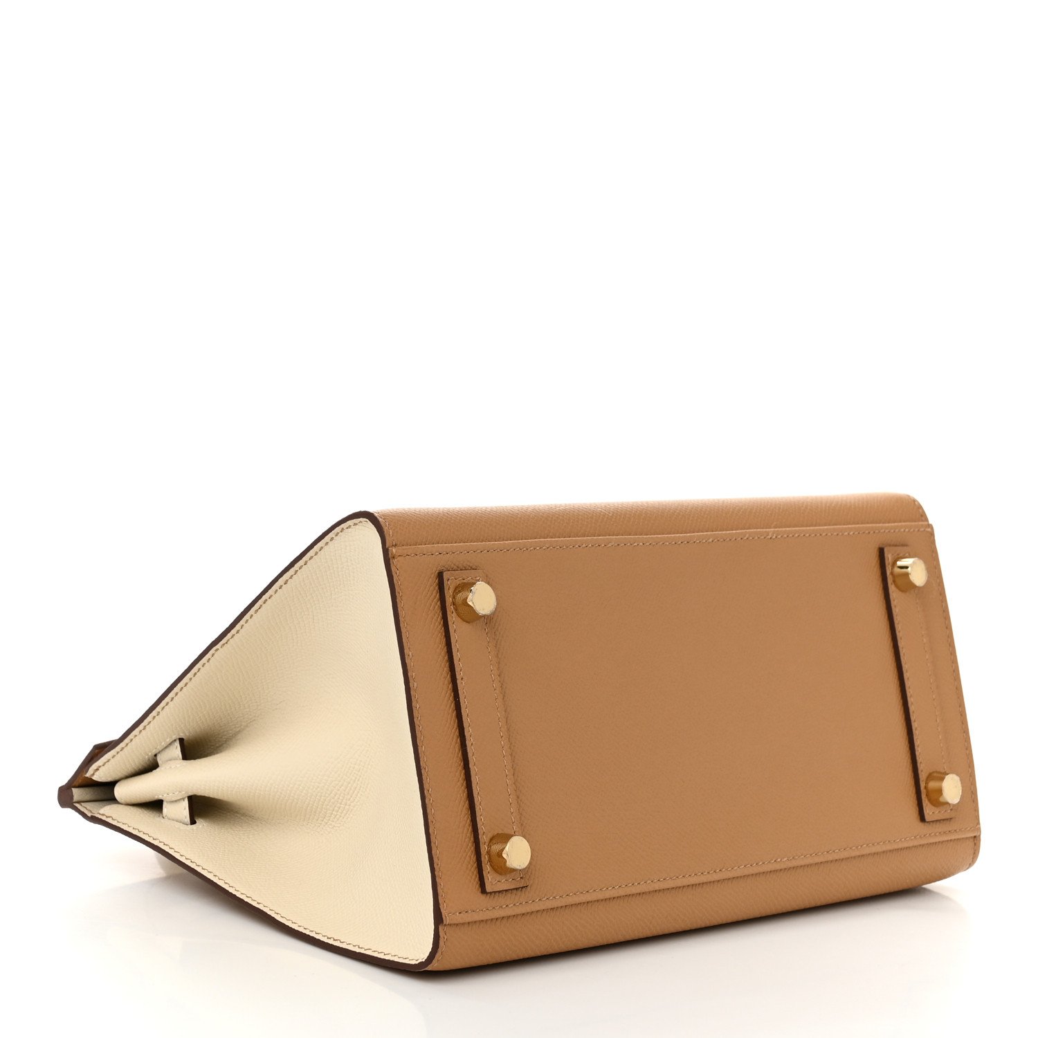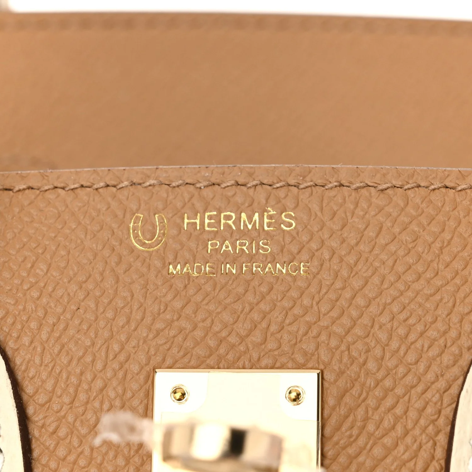This is an authentic HERMES Epsom Horseshoe Birkin Sellier 25 in Chai and Nata. This handbag is constructed with grained Epsom calfskin leather in light brown and off-white. It features rolled leather top handles, a front flap and strap closure and permabrass hardware including a turn lock, a padlock, and a clochette for keys. This opens to a matching chevre goatskin leather interior with zipper and patch pockets.