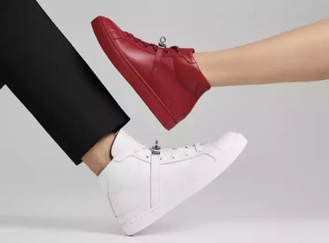 With their pared-down look, these leather high-top sneakers for him and her feature an Hermès icon – the Kelly clasp – on their upper. The buckle accentuates the ankle and highlights the leather with its refined touch. Available in several versions with matching or contrasting soles. Great for both men and women to add to their Hermes collections.