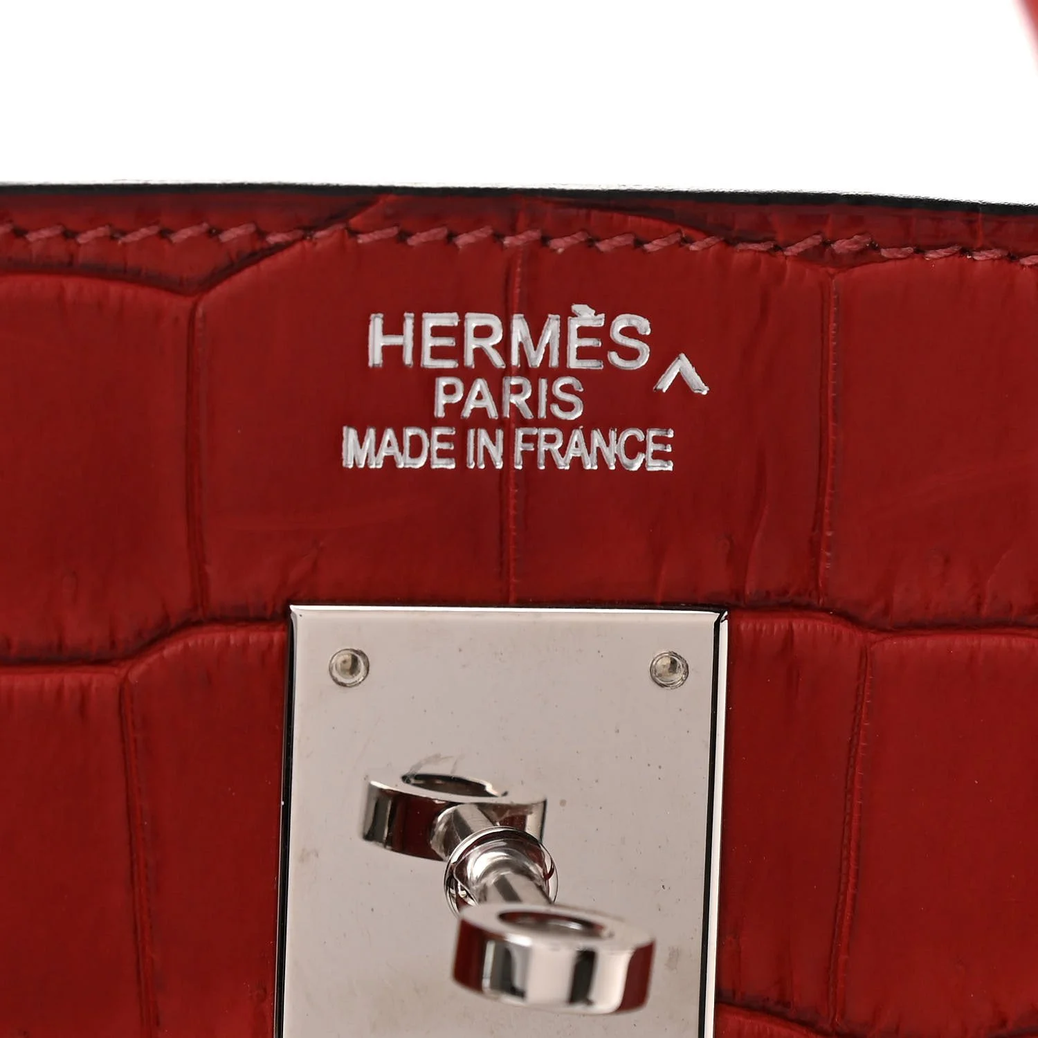 We guarantee this is an authentic HERMES Matte Porosus Crocodile Birkin 40 Rouge H or 100% of your money back. The original creation of this iconic bag was a collaboration between the French Hermes and the British actress Jane Birkin. This stunning handbag is featured here in luxurious matte crocodile including the padlock and a "clochette" or bell to store the keys. Palladium silver hardware is found at the straps, lock and feet. The top flap opens to an interior of chevre goatskin leather with zipper and patch pockets. This bag is in equal measure classically traditional and forwardly chic. It is commonly understood to be the most sought after bag in the world and rarer still in porosus crocodile.
