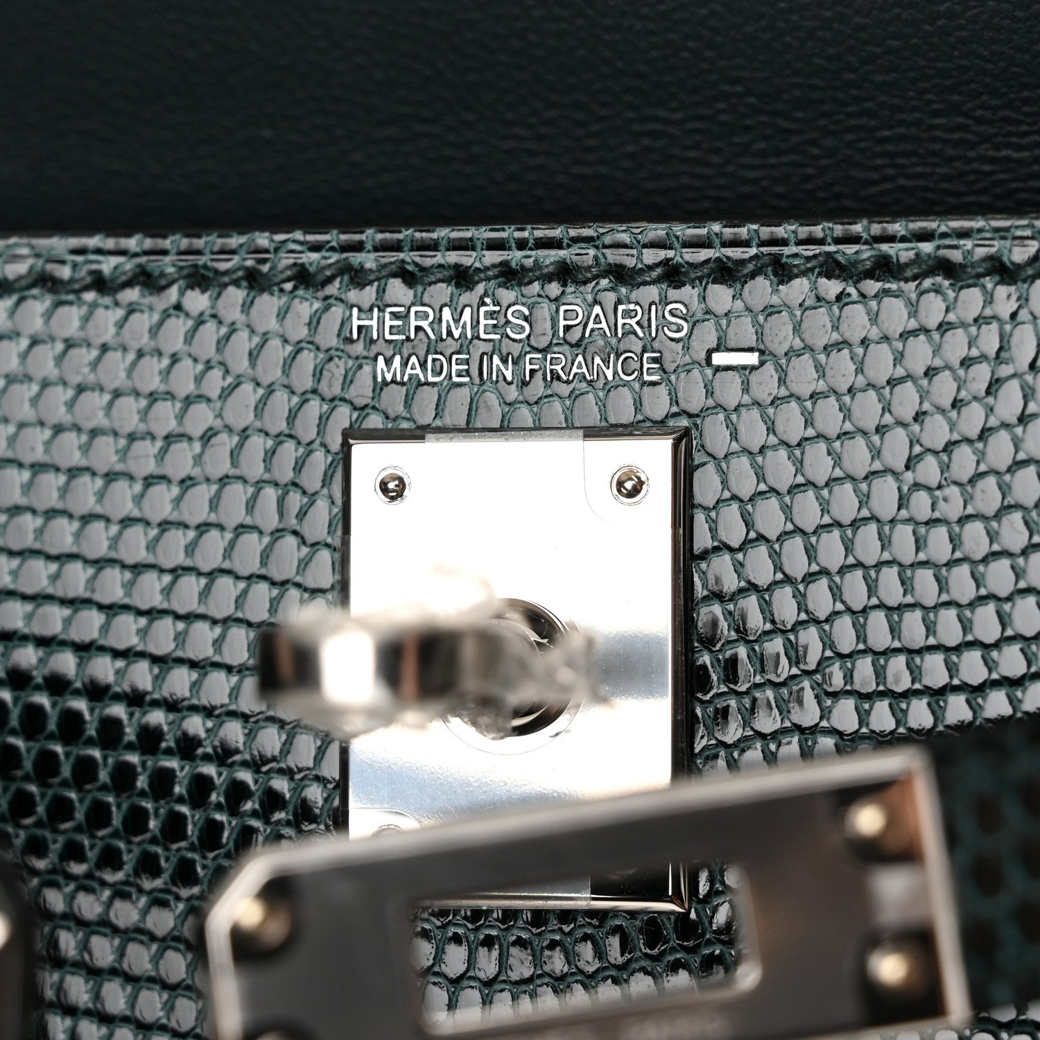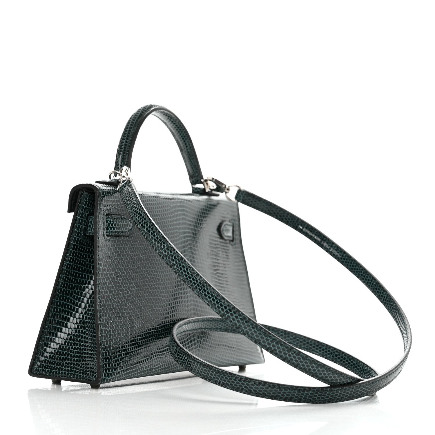 This is an authentic HERMES Shiny Lizard Mini Kelly Sellier 20 in Vert Cypress. This stunning Hermes classic handbag is beautifully crafted in dark green exotic lizard skin. A single rolled leather top handle is secured with polished silver plated hardware and a removable leather shoulder strap. The traditional Kelly turn lock secures the small flap. The interior features a matching lambskin leather with a single flat pocket.