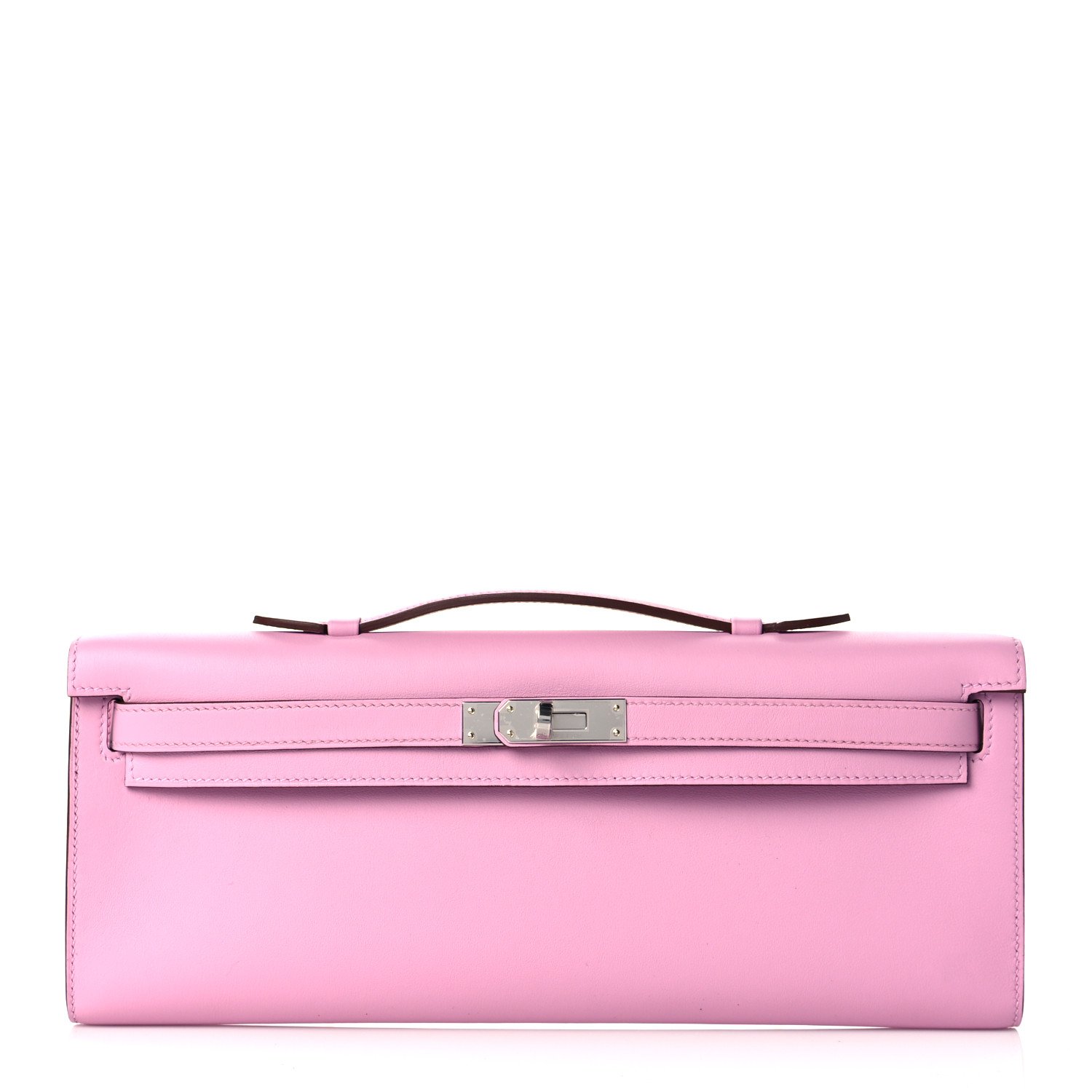This is an authentic HERMES Swift Kelly Cut Clutch Pochette in Mauve Sylvestre. This chic clutch is crafted of fine swift calfskin leather in pink. In the style of the Kelly handbags, the clutch has a leather strap handle, a cross over flap and strap closure with a silver plated Kelly turn lock. This opens to a matte leather interior with a patched pocket.