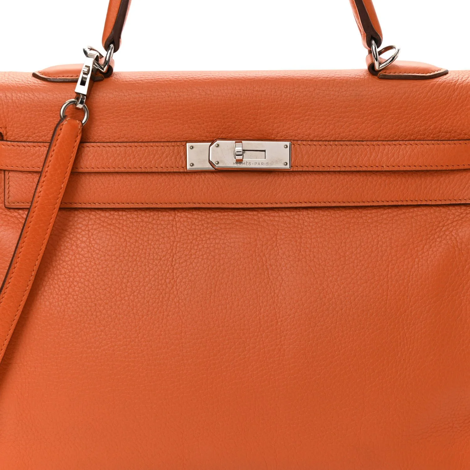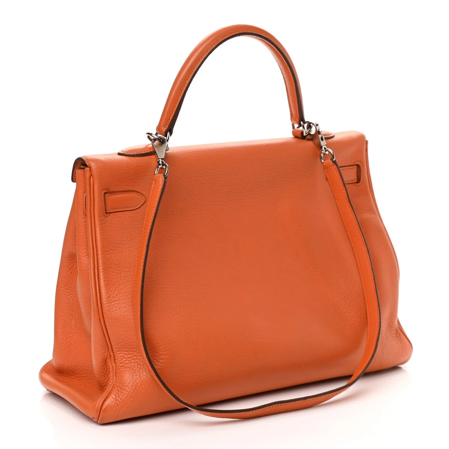 This is the authentic HERMES Togo Kelly Retourne 35 in Orange. This handbag is crafted of togo calfskin leather in orange. The bag features a reinforced leather top handle with palladium plated links, an optional removable leather shoulder strap, and a front flap which is secured with leather straps. The flap opens to a matching leather interior with zipper pocket and patch pockets.